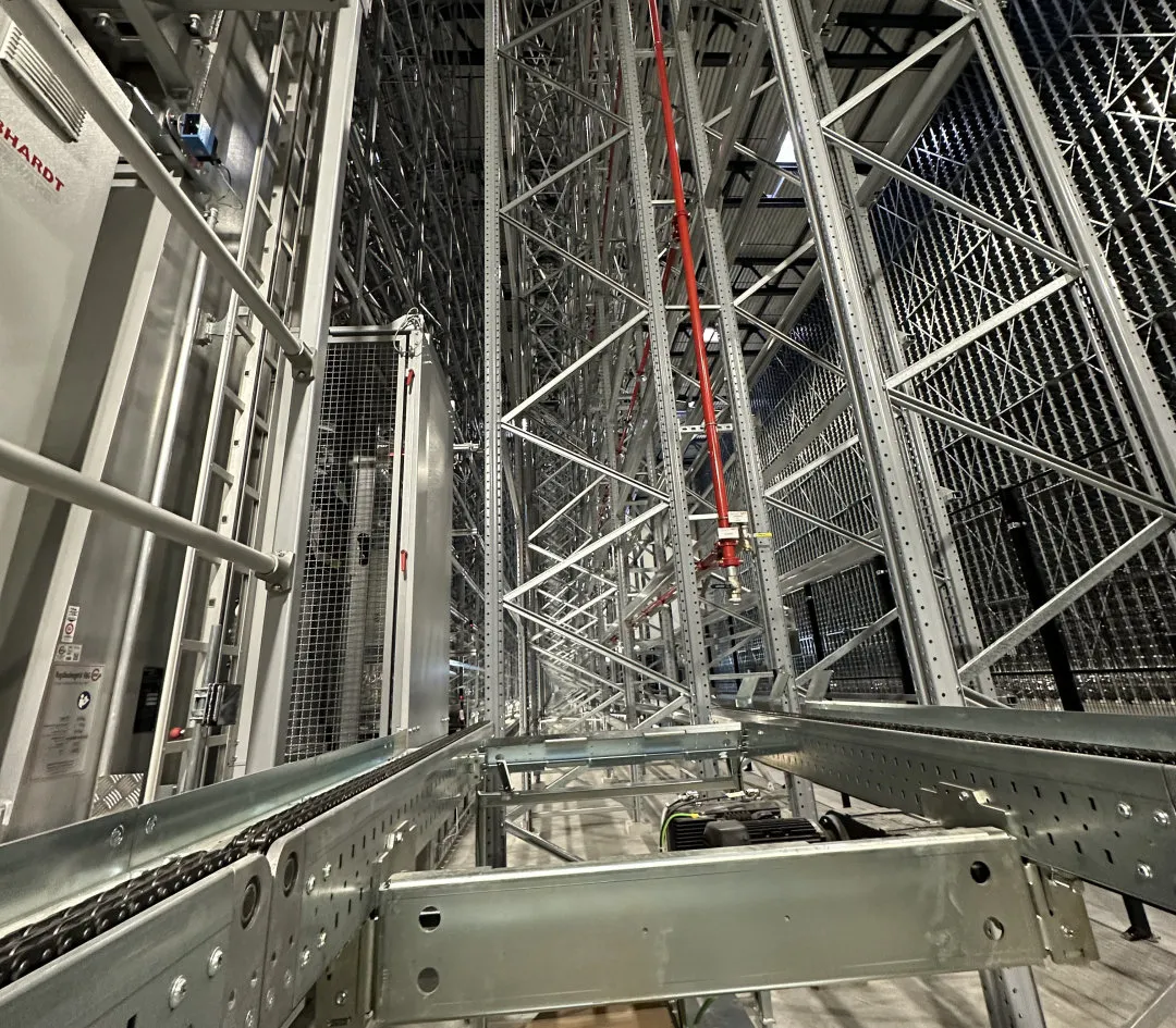 KEB位于Barntrup (North Rhine-Westphalia)的总部展示了现代物料搬运应用的实际运作方式。所有零部件和半成品都存储在新建的高层货架仓库中。这座高达25米的悬臂式仓库不仅在建筑上令人印象深刻,其存取系统中采用的技术亦颇具亮点。除自动化小型零件仓库内配有两台堆垛机(SRS),用于存放 58,000 个 1/4 EUR 标准集装箱外,另一个区域还部署了三台堆垛机,专门处理8000个托盘——这些堆垛机均配备了创新的IIoT解决方案,并可选择采用选配持续直流电(DC)技术。这两套存取系统的基本功能一致。每台设备均由底盘、提升机构和带伸缩臂的负载搬运装置(LAM)构成,用于拾取和放置负载载体。
